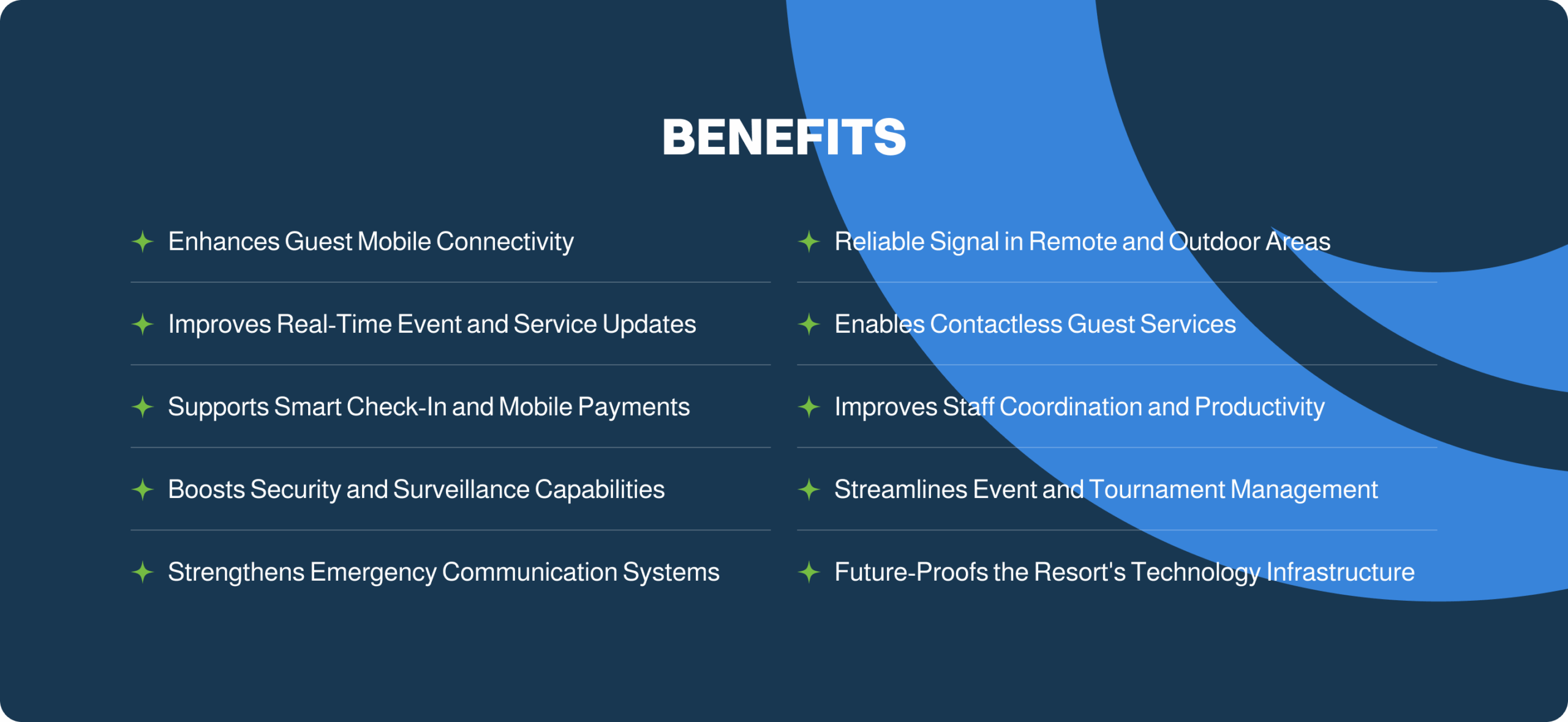 Golf resorts must provide exceptional wireless connectivity to meet the expectations of guests and visitors. From seamless social media sharing to connected golf carts & course operations, modern golf enthusiasts demand reliable, high-performance mobile networks throughout outdoor areas and indoor facilities.