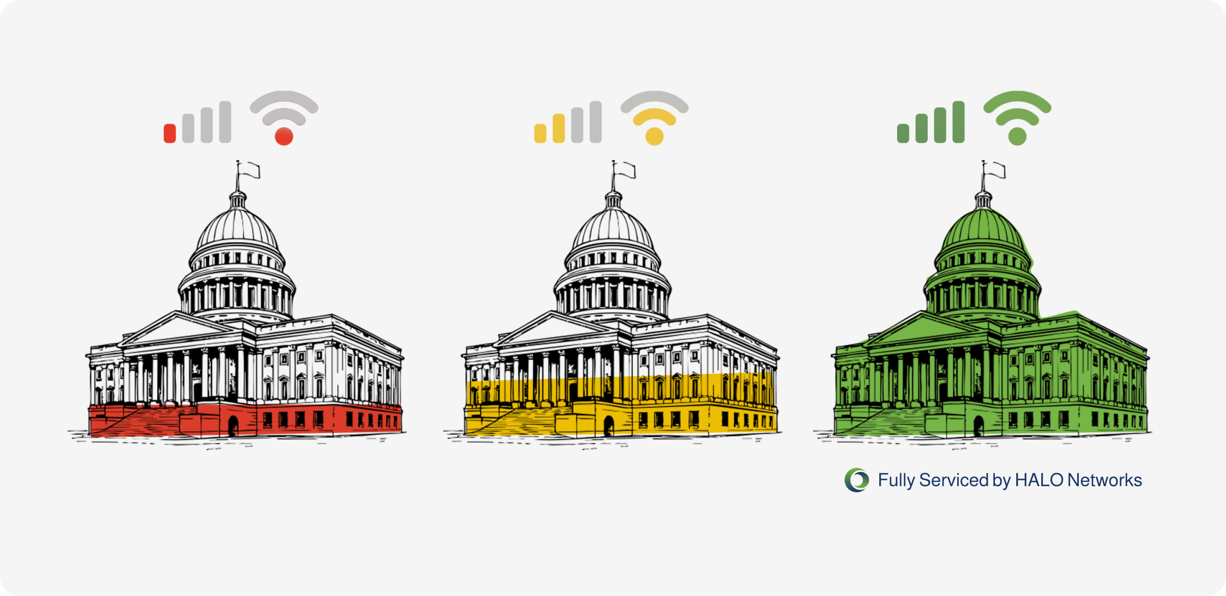 To address these needs, government IT leaders partner with HALO Networks to deploy comprehensive wireless infrastructure solutions that deliver dependable coverage, capacity, and security where it matters most. From administrative offices and public service areas to secure zones and outdoor spaces, HALO’s wireless infrastructure supports a wide range of communication requirements across government facilities.